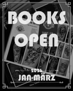 Das Booking für’s erste Quartal 2026 ist eröffnet! Ab sofort könnt ihr Tattoo-Termine für die Monate Januar, Februar und März 2026 bei Macy, Milan und Scotty vereinbaren. Bitte kümmert euch rechtzeitig um eure Termine, wenn ihr euch im Winter/Frühjahr tätowieren lassen wollt – die Kalender füllen sich erfahrungsgemäß sehr schnell. Vereinzelt gibt es aber auch für dieses Jahr noch freie Termine!